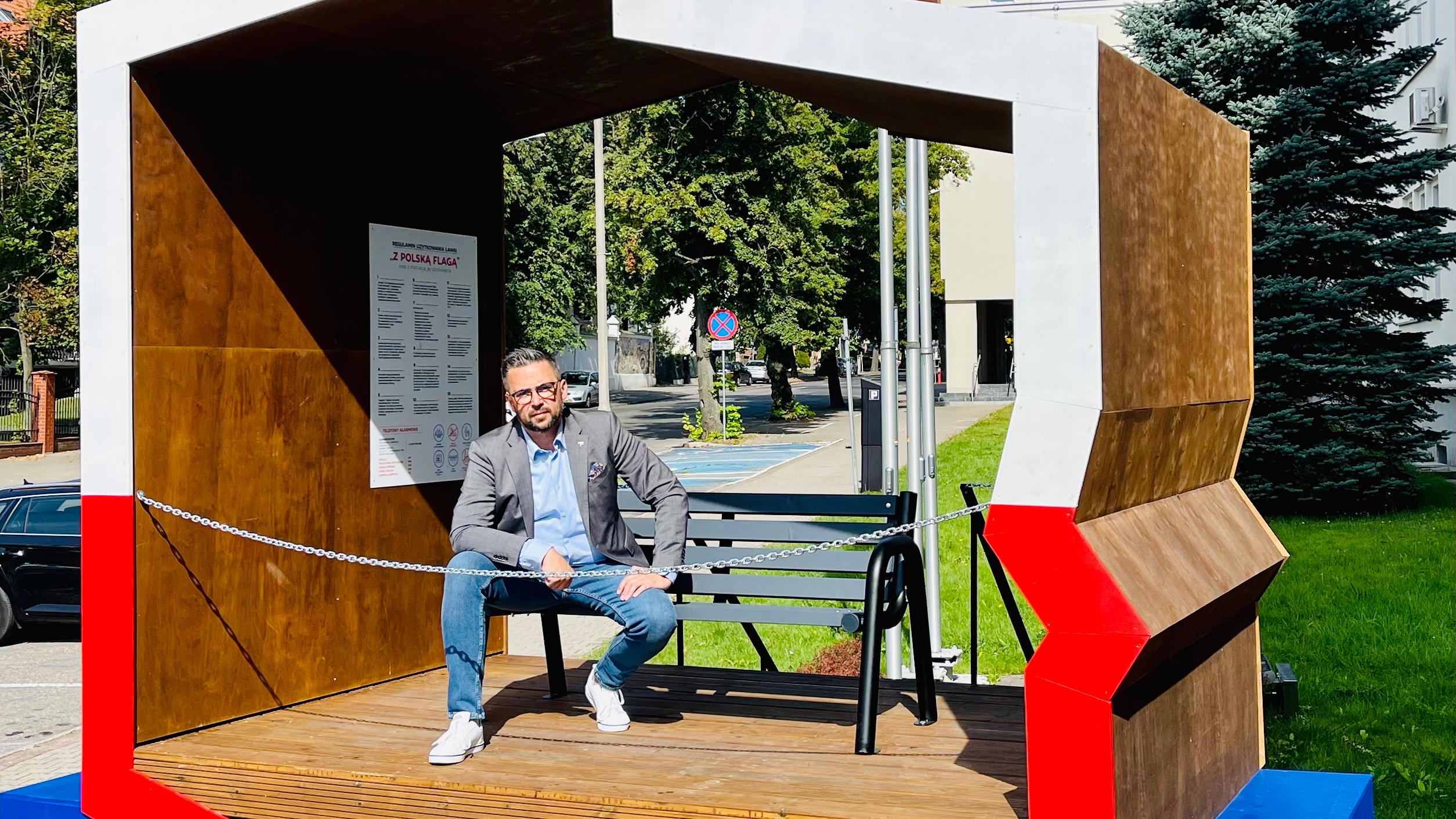 Ponieważ koszt instalacji jest powalający i nie chciałem nic uszkodzić, starałem się siedzieć zgodnie z piętnasto punktowym Regulaminem Użytkowania Ławki „Z Polską Flagą” przytwierdzonym do konstrukcji. I tu już pojawił się drugi zgrzyt (pierwszym była wartość siedziska). Otóż, jeśli siedzi się zgodnie z instrukcją obsługi tego patriotycznego obiektu, to wzrok użytkownika ławeczki pada wprost na …olsztyńskie „szubienice”, czyli Pomnik Wyzwolenia Ziemi Warmińsko-Mazurskiej, które budzą i budziły kontrowersje przez dziesięciolecia. Sam osobiście postulowałem publicznie przeprowadzenie referendum w sprawie usunięcia lub pozostawienia pomnika w starym miejscu. Chyba coś twórcy instalacji w tym punkcie „nie pykło” – jak mówi młodzież.